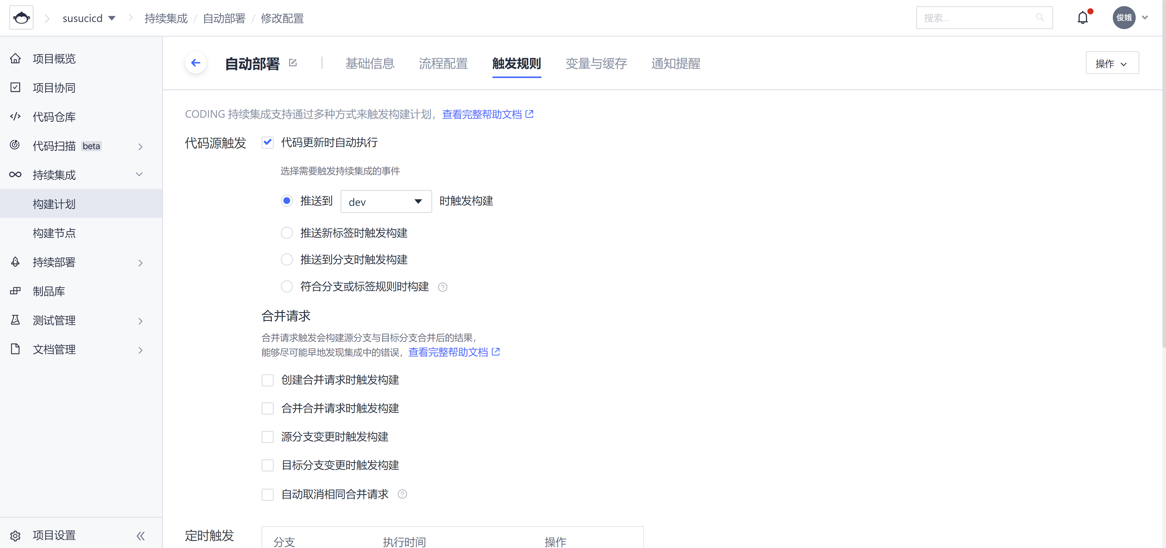 触发规则配置。本例中配置代码推送到 dev 分支时触发构建。