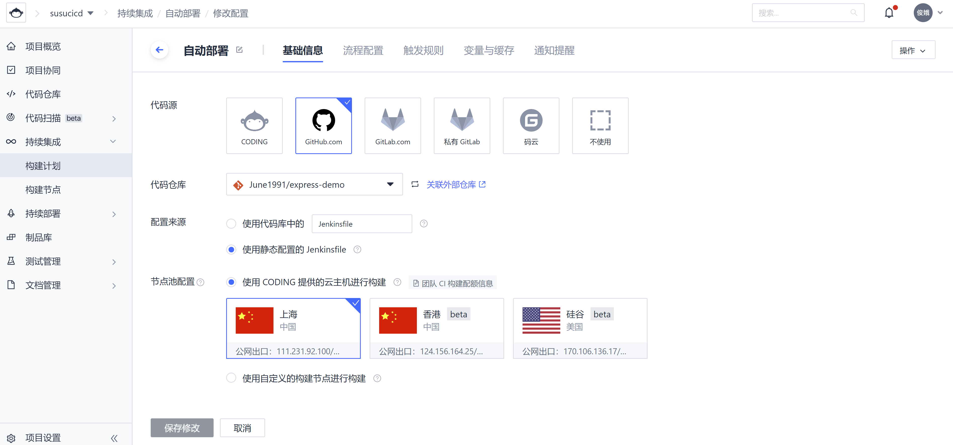 基础信息配置。本例中配置 Github 仓库:June1991/express-demo。