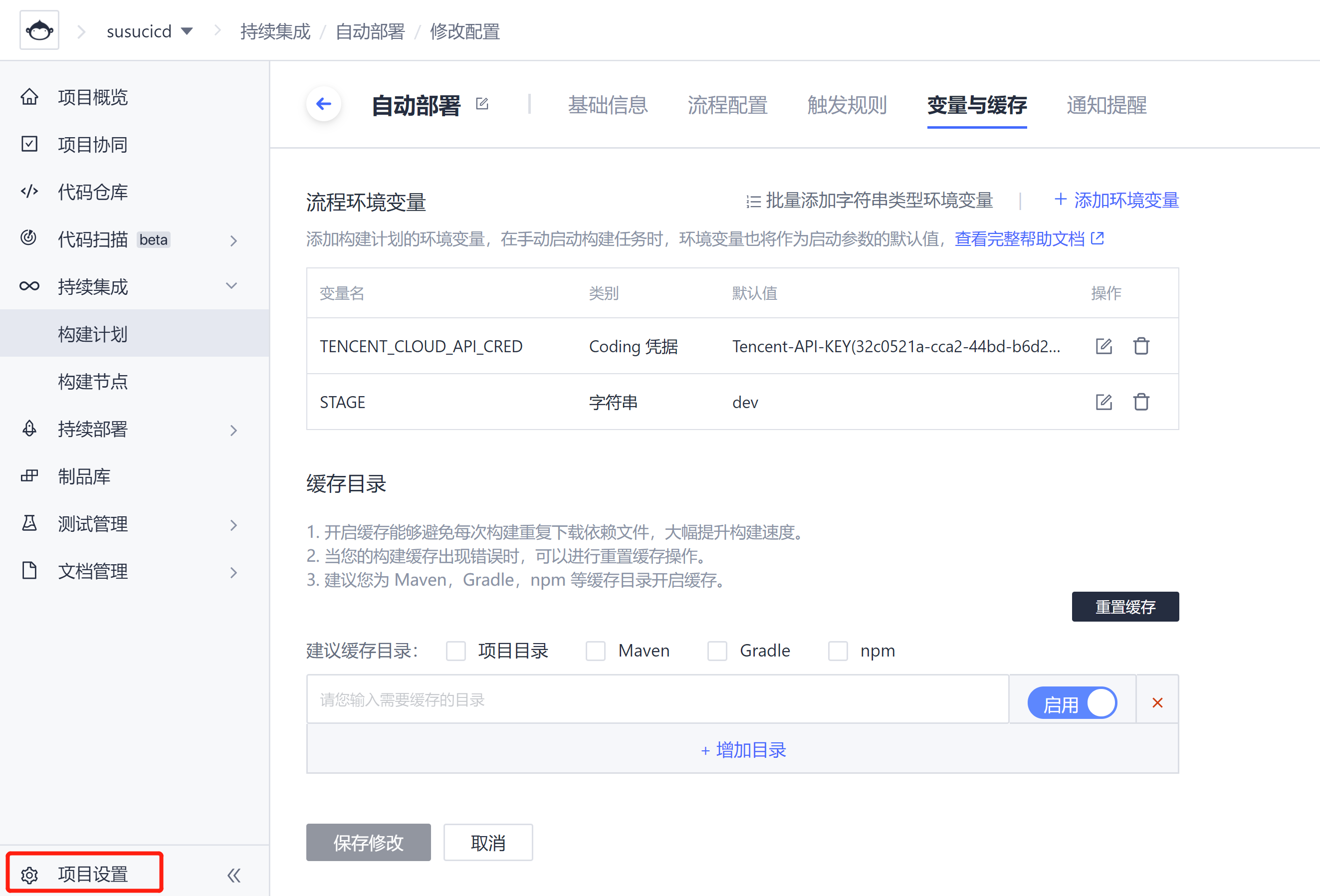 环境变量配置。本例中配置 STAGE 变量为部署环境 dev,TENCENT_CLOUD_API_CRED 为腾讯云账号密钥(密钥配置路径:左下角项目设置 > 开发者选项 > 凭据管理 > 录入凭据 > 腾讯云 API 密钥)。