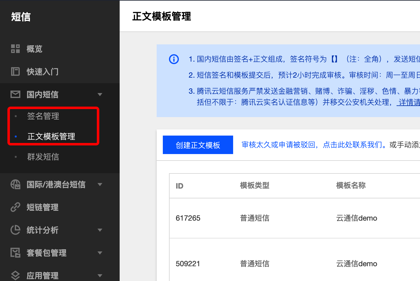1.到腾讯云短信控制台申请模板和签名,可参考短信快速入门指引。